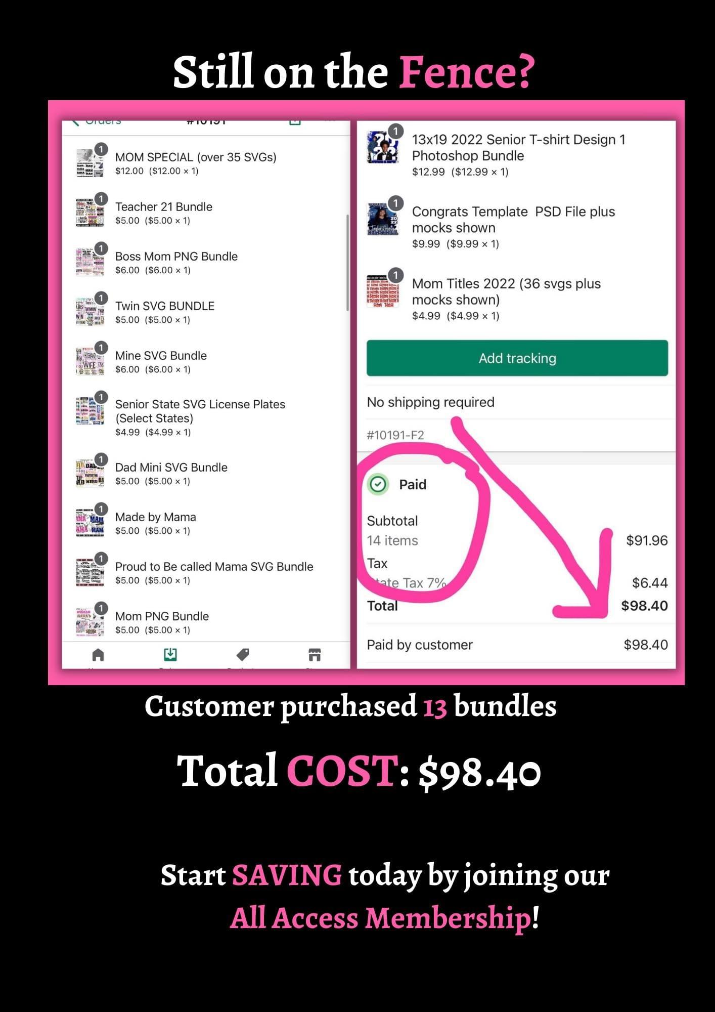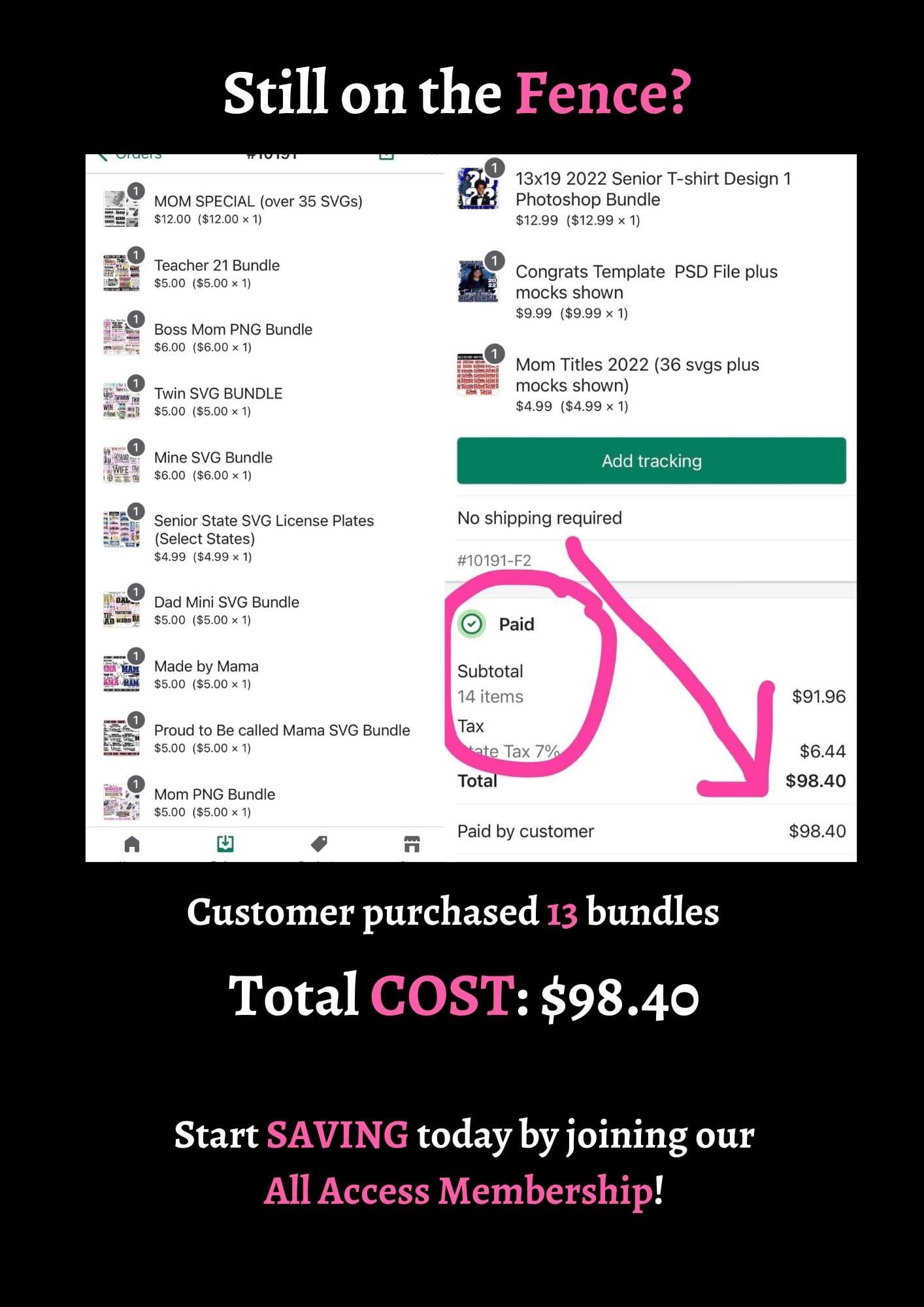 That's right.. INSTANT access to over 1000 folders filled with svg digital files, PNG files, templates for programs like Canva and Photoshop PLUS complimentary mock-ups and promo flyers